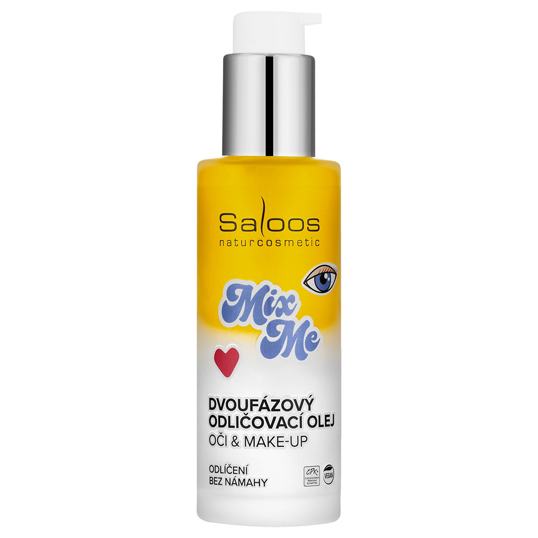 Dvoufázový přírodní odličovací olej na oči a make-up od Saloos kombinuje šetrné složky přírodního původu, které rozpouští i voděodolný make-up, aniž by dráždily citlivé oční okolí. Tento **Mix Me** olej je navržen tak, aby se obě fáze snadno promíchaly a aktivní složky pronikly do pleti, uklidnily ji a zachovaly její přirozenou ochranu.